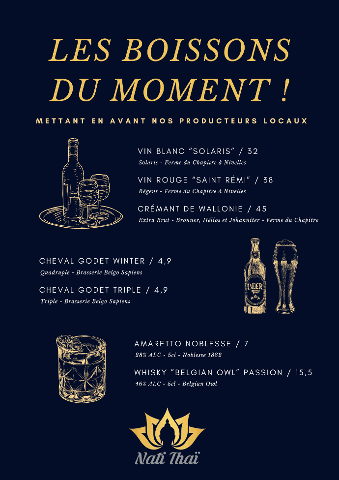 Cartes boissons comprenant des vins, des bières et des digestifs artisanaux et belges !